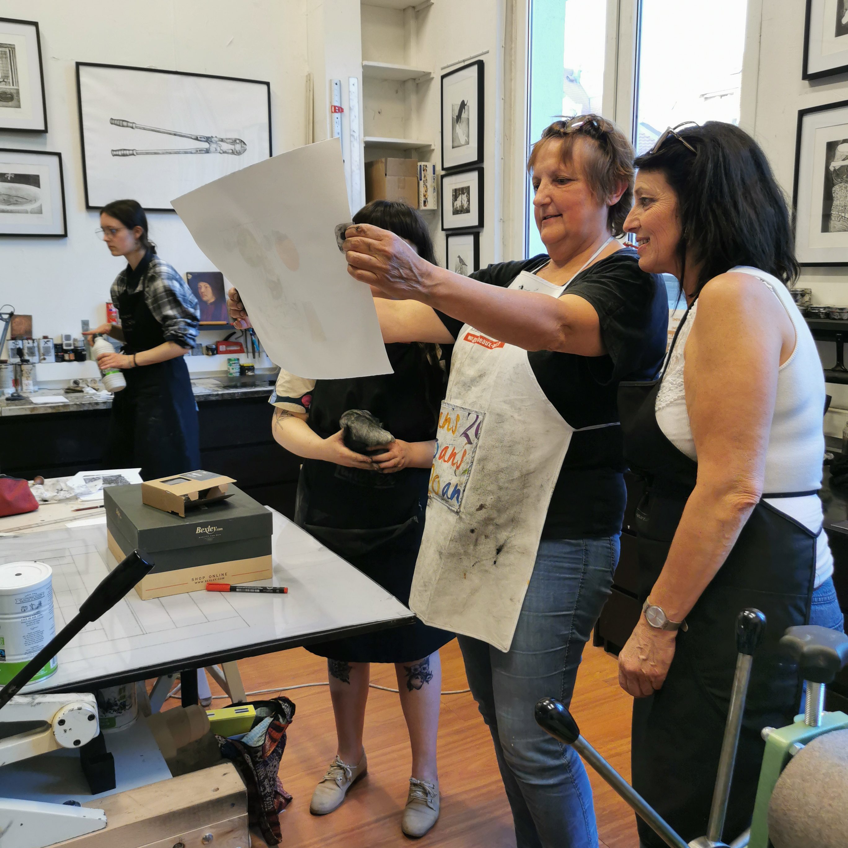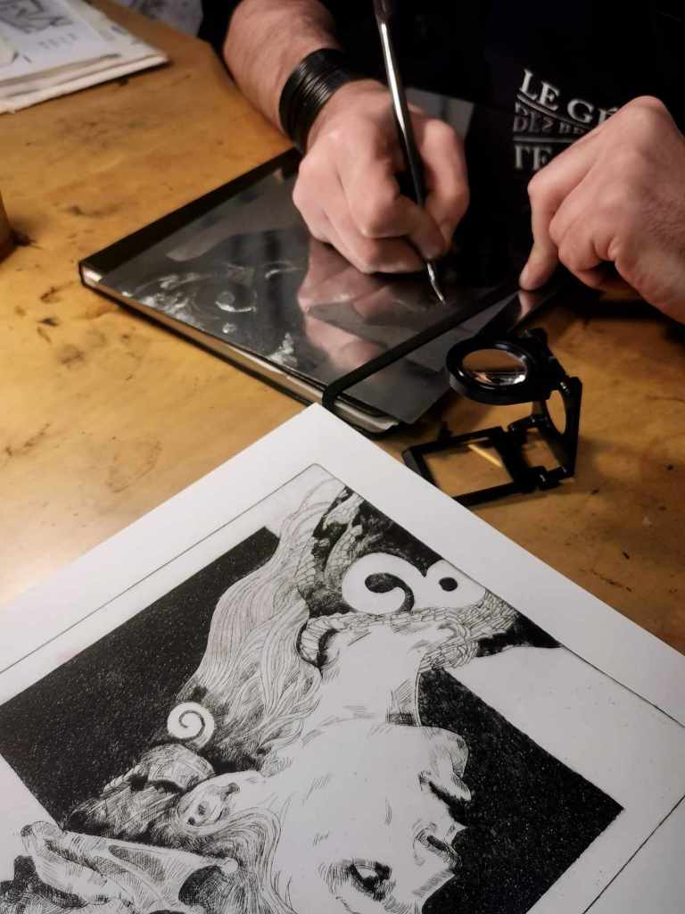 Nous mettons à votre disposition, des outils professionnels, des encres et papiers de belles qualités, et bien sûr notre expérience. Nul besoin d’avoir de grandes bases en dessin, nous vous guidons et conseillons. Nous cherchons aussi à créer un espace convivial et bienveillant dans l’échange et le partage des savoirs.