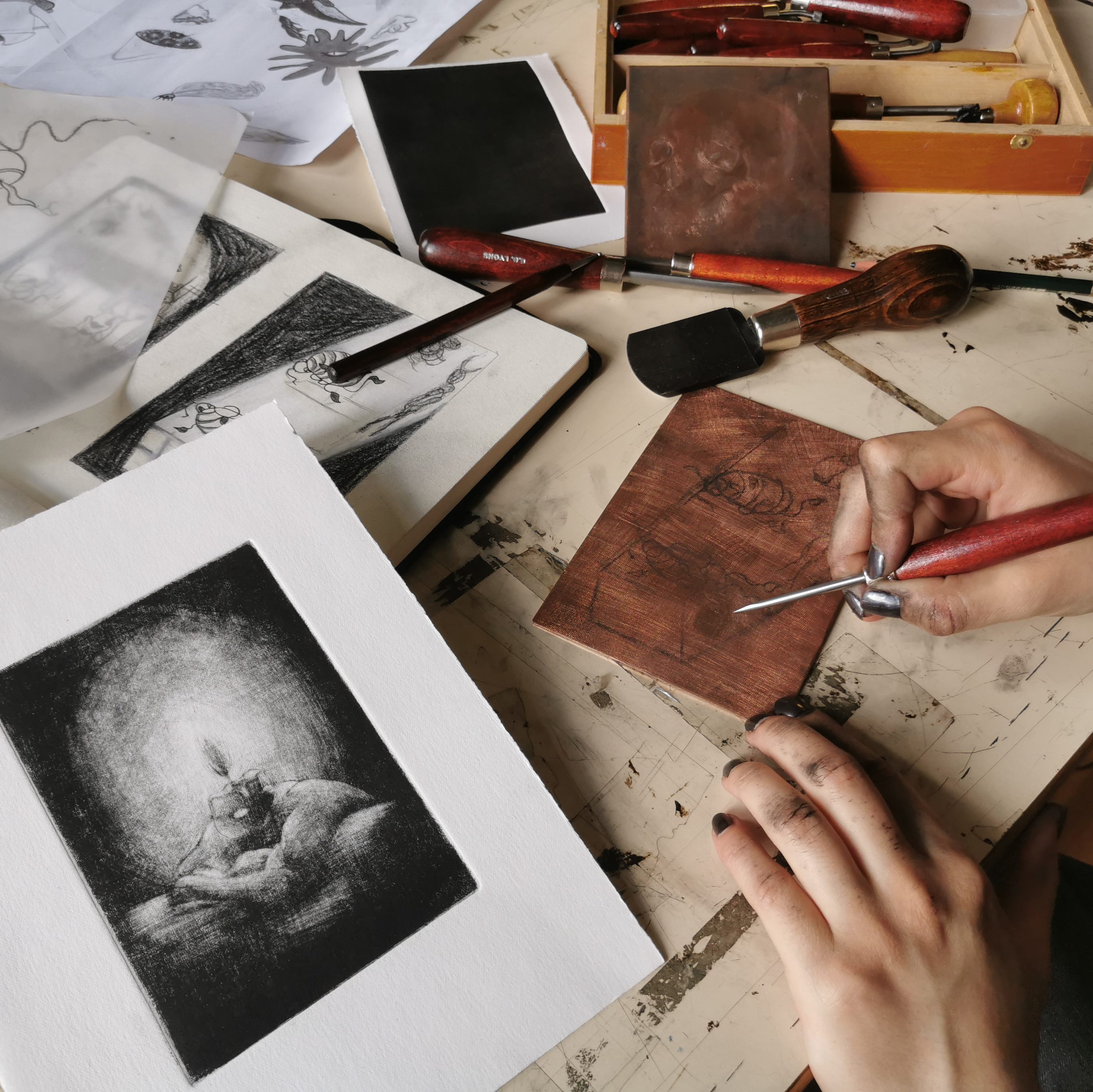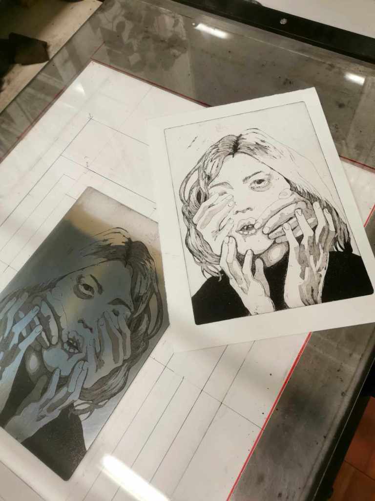 (En pause) Atelier du jeudi après-midi pour s’initier et s’exercer à la gravure. Pointe sèche, eau forte et aquatinte sur zinc (procédé non-toxique et méthodes alternatives), manière noire mais aussi le vernis mou, le sucre, le monotype et la taille d’épargne (linogravure & bois)